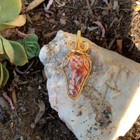 Leopard Skin Jasper triangular stone with gold wrap; 1" w x 2 3/8" H incl bail
